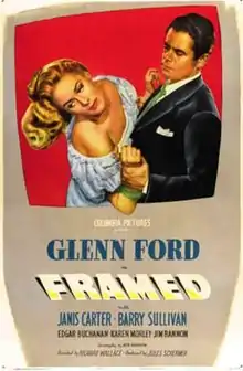 Framed is a 1947 American crime film noir directed by Richard Wallace and starring Glenn Ford, Janis Carter and Barry Sullivan. It was released by Columbia Pictures. The movie is generally praised by critics as an effective crime thriller despite its low budget.[1]