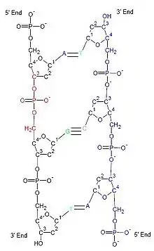 Diagram that emphasises the phosphate backbone of DNA. Watson and Crick first made helical models with the phosphates at the centre of the helices.