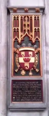 Winchester Cathedral, memorial for Field Marshal Lord Grenfell showing his coat of arms: Gules, on a fess between three clarions or a mural crown of the first.[1]