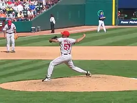Rodríguez received his second career Delivery Man of the Month Award after posting 11 saves in 12 appearances during the month of June.[3] Rodríguez set a major league record by recording his 35th save before the All-Star Break, breaking the previous record of 34 set by John Smoltz in 2003.[4] He was a member of the American League All-Star Team for the third time and made a brief appearance in the game, facing two batters while walking one.[5] On August 20, 2008, he set both his and the Angels single season record with his 48th save.[6] With his 50th save on August 24, 2008, Rodríguez became the first relief pitcher to reach that number since Mariano Rivera in 2004 and the ninth overall.[7] He was also the youngest pitcher to ever reach that number at 26 years, 7 months, and 17 days. In addition, he reached that milestone in 129 team games, faster than any pitcher in history.[8] With three saves during the week of August 18–24, including the milestone of number 50, Rodríguez was awarded the American League Player of the Week for the first time in his career.[9]
