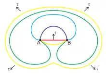 When the dislocation becomes a semicircle, all of the line tension is acting against the bending force induced by the shear stress, because the line tension is perpendicular to the horizontal between A and B. For the dislocation to reach this point, it is thus evident that the equation:[3][4]