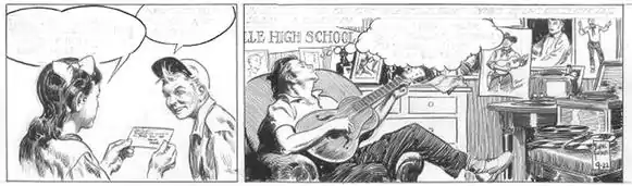 Godwin's two major strips, seen over three decades, were Connie (Ledger Syndicate, 1927[5]–1944) and Rusty Riley (King Features Syndicate, 1948–1959). Most of Godwin's comic strips over the years were for the Ledger Syndicate, including Vignettes of Life (1924–1927); Connie (1927–1944); Babe Bunting (1930–1939); The Wet Blanket (c. 1933–c. 1941); War on Crime (1936–1938); and Roy Powers, Eagle Scout (1938–1940).[6] Godwin stepped in to replace illustrator Kemp Starrett on writer Paul Powell's daily strip Roy Powers, Eagle Scout ("the official strip of the Boy Scouts of America"), continuing until 1942.[7]