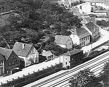 Next to the two through tracks, there was a dead-end track in the northern part of the station and another freight track in the southern part.[31] In the eastern railway station area, there was a signal box on the north side of the railway tracks.[32] In the meantime the facilities have been dismantled and the station has been reclassified as a Haltepunkt (halt).[33] Remains of the northern dead-end track still exist. In addition to the platform, there was an island platform between the two main tracks, which was later replaced by an external platform on the southern side of the station.[30]