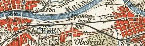 The terminus of the line was in Offenbach on a plot of land northwest of the centre of the city at that time. This area was west of Kaiserstraße between Domstraße and Bahnhofstraße (streets). The station—later called Lokalbahnhof—was built on the eastern edge of Sachsenhausen between Darmstädter Landstraße, Heisterstraße and Dreieichstraße and was originally called Sachsenhausen station, later Old Sachsenhausen station. Stations were also built north of Oberrad and at the current street of Wasserhofstraße.