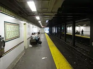 The Botanic Garden station on the BMT Franklin Avenue Line has two tracks and two side platforms.[31] The station is named for the Brooklyn Botanic Garden two blocks away from the station.[30]