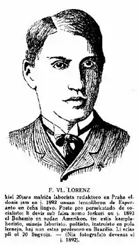 František Vladimír Lorenc (24 December 1872 – 24 May 1957), known in Portuguese as Francisco Valdomiro Lorenz, was a Czech-born polyglot and philosopher born in Zbyslav (nowadays part of the Czech Republic). He was one of the first Esperantists in the world, and was able to communicate in over 100 different languages.[1] Lorenz was persecuted by the Austro-Hungarian monarchy due to his involvement with Esperanto, which was associated with socialist revolutionary movements in the region, and he subsequently moved to Brazil as a political refugee in 1891. In Brazil, he lived in Rio de Janeiro at first, and then in Rio Grande do Sul (Southern Brazil). Lorenz published over 36 books in 40 languages and was one of the most prominent promoters of Esperanto movement ever in Brazil.[2] He died in Dom Feliciano (Brazil) in 1957.