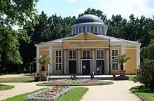 On 27 April 1793, the town was officially founded under the name Kaiser Franzensdorf, after Emperor Francis II, and later renamed Franzensbad. The spa was founded by Eger-based doctor Bernhard Adler (1753–1810).[5] He promoted the expansion of spa facilities and the accommodation for those seeking healing and promoted the transformation of the swampy moorland with paths and footbridges to well-known sources. The town was laid out around 24 springs in an orthogonal plan.[6]