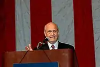 Thompson supported free trade and low taxes.[46][47] He was a self-described authentic conservative since he was part of the Conservative Revolution of the 90s. He said that Roe v. Wade was a wrong decision that ought to be overturned, and that he was anti-abortion,[48] but he also said that states should decide not to criminalize young women for early term abortions.[49][50] Thompson was skeptical that humanity is to blame for global warming.[51] He said citizens are entitled to keep and bear arms if they do not have criminal records.[52] Thompson's support of the McCain-Feingold campaign finance legislation brought criticism from groups such as Gun Owners of America (GOA), who said that the legislation limited their ability to inform the public about the gun rights voting records of incumbent politicians.[53] Thompson said that the limitation on political speech within thirty or sixty days of an election was wrong and should be repealed.[54] Thompson said U.S. borders need to be secured before considering comprehensive immigration reform.[46] Thompson supported the U.S. invasion of Iraq, but later stated that mistakes had been made since then.[55] He opposed withdrawal from Iraq.[56] He also believed that Iran should be taken seriously.[57]