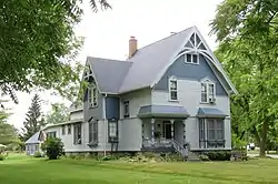 This house is a large, two-story, frame structure with a gable-roof main section and gable-roof wings on either side. The gables are steeply pitched and trimmed by plain bargeboards with brackets at the lower ends and open timberwork gable ornaments. The main body of the house is clad with clapboard, while the gables, the second stories of the side extensions, and the bay window and pent roof of the recessed front porch are shingled. The entrance is through a small front porch, recessed into a corner of the first floor. The porch has lathe-turned columns with brackets. The windows are double-hung, sash units, some of which have pedimented caps.[2]
