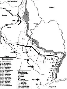 - ↑ It was expected that a German advance would take nine days to reach the Meuse but in 1940 it took under three days.[11]