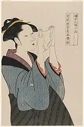 Kitagawa Utamaro (c. 1753–1806) made his name in the 1790s with his bijin ōkubi-e ("large-headed pictures of beautiful women") portraits, focusing on the head and upper torso, a style others had previously employed in portraits of kabuki actors.[4] Utamaro experimented with line, colour, and printing techniques to bring out subtle differences in the features, expressions, and backdrops of subjects from a wide variety of class and background. Utamaro's individuated beauties were in sharp contrast to the stereotyped, idealized images that had been the norm.[5]