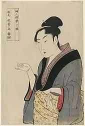 A finely-patterned obi sash that wraps around her light, summer [13] haori, a kimono-like jacket. The grey haori[14] is of silk gauze, and its sleeves have slid down the woman's arms, revealing their white skin at the centre of the composition.[13] Five-leafed ivy mon crests adorn the kimono, as well as a three-leafed ivy crest on the fan, signifying this is Naniwa O-Kita,[lower-alpha 2][8] a famed teahouse girl who appeared in many prints by Utamaro and others.[13]