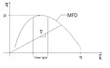 A macroscopic fundamental diagram (MFD) is type of traffic flow fundamental diagram that relates space-mean flow, density and speed of an entire network with n number of links as shown in Figure 1. The MFD thus represents the capacity, , of the network in terms of vehicle density with being the maximum capacity of the network and being the jam density of the network. The maximum capacity or “sweet spot” of the network is the region at the peak of the MFD function.