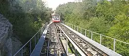 Funiculaire Sierre–Montana–Crans (abbreviated SMC) is a funicular railway in Valais, Switzerland. The line leads from Sierre at 540 m to Crans-Montana at 1471 m. The funicular has a single section of about 4300 m since 1997 making it the longest.[1] Earlier, it had two sections with the break at St-Maurice-de-Laques. The funicular with two cars has a single track with a passing loop. The funicular was closed from March to December 2022 for new tracks and cars, fewer intermediate stations to allow 20-minute intervals[2][3] and a journey time of 14 minutes.[4]