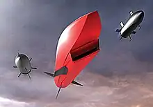 An artist's depiction of the Perseus hypersonic multi-role cruise missile concept. Note the two submunitions which have been released from the lateral bays of the parent missile.