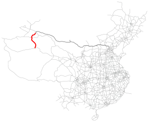 The expressway starts in Saybag District, Ürümqi, then passes through Korla and Yuli County along the eastern part of the Taklimakan Desert to Ruoqiang County.[2]