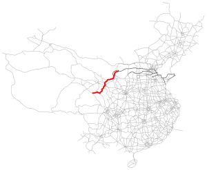It is complete between Shizuishan and Qingtongxia in Ningxia[1] and between Guanghe County and Hezuo in Gansu. In November 2020, the section between Jingtai and Lanzhou New Area opened.[2] In December 2021, the section between Qingtongxia and Zhongwei opened.[3]