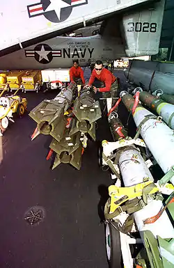 ![]() Armorers loading GBU-16s onto aircraft for transport | |