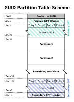 The layout of a disk with the GUID Partition Table. In this example, each logical block is 512 bytes in size and each entry has 128 bytes. The corresponding partition entries are assumed to be located in LBA 2–33. Negative LBA addresses indicate a position from the end of the volume, with −1 being the last addressable block.