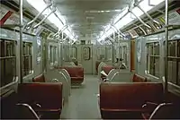 The interior of a G1 car, one of two where the original incandescent lighting was experimentally replaced with fluorescent