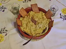 The gachas serranas of Cuenca is a local variant, usually served with mushrooms and potatoes (Called zarangullo). In the comarca of la Serranía, stewed and pickled pork liver and lung is added to the gachas when the water is added, or is eaten to accompany the gachas. Other possible accompaniments include hot chilis or pickled gherkins.[5]