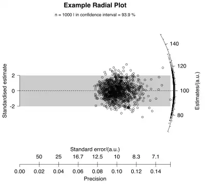 In statistics, a Galbraith plot (also known as Galbraith's radial plot or just radial plot) is one way of displaying several estimates of the same quantity that have different standard errors.[1]