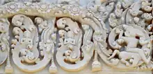 Ganesha also appears in Buddhism, not only in the form of the Buddhist god Vināyaka, but also portrayed as a Hindu deity form also called Vināyaka.[9] His image may be found on Buddhist sculptures of the late Gupta period.[10] As the Buddhist god Vināyaka, he is often shown dancing, a form called Nṛtta Ganapati that was popular in North India and adopted in Nepal and then into Tibet.[11] A dancing Ganesha is evident in the Malay archipelago in the temple of Candi Sukuh.