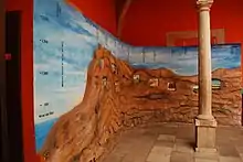 The museum's facade is noted for its simplicity, as it shows only the access gate framed in quarry. The interior is small with only 7 permanent exhibition rooms.[3] Of the exhibition rooms, the Loma San Gabriel Stage room is of particular significance, as it depicts types of housing and instruments (estimated to be around 3,000 years old) from the Loma San Gabriel culture, perhaps the forerunner of the contemporary Coras, Huichols, and Tepehuanes who still inhabit Durango.[3]