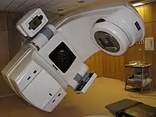 The gantry of an external beam radiotherapy machine moves a radiation source around a patient. A linear accelerator (linac) is built into the top part of the gantry in the photo at the right. The rectangular screen on the right side of the gantry is a cone beam x-ray detector, which is used to help position a patient prior to treatment.
