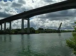 The Garden City Skyway is a major high-level bridge located in St. Catharines and Niagara-on-the-Lake, Ontario, Canada, that allows the Queen Elizabeth Way (QEW) to cross the Welland Canal without the interruption of a lift bridge. Six lanes of traffic are carried across the bridge, which is 2.2 kilometres (1.4 mi)[2] in length and 40 metres (130 ft) at its tallest point.