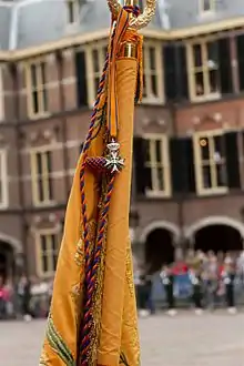 When the regiment was promoted to the status of guards in 1948, they adopted a ceremonial uniform. To commemorate the unit's foundation in the United Kingdom, it was decided to adopt the style of the traditional British "full dress" infantry uniform, with a scarlet tunic and the dark blue "Home Service" helmet, which is also used by the Netherlands Marine Corps.[2] The five-pointed star-shaped helmet badge commemorates the star used as a recognition emblem by the Allied forces in the North-West Europe Campaign of 1944–1945.[1] The buttons of the tunic carry the Netherlands lion in relief. Only the upper button on cuff flaps carry the lion though the middle button has two crossed cannon barrels and the lower an antique helmet. They symbolize the infantry, artillery and engineers of the original unit. The lace on the collar signifies a Netherlands guards unit, while the cuffs are modeled on those worn by the British Guards Division. The retaining cord is a sign of commissioned rank and an indication of rank in the Netherlands army, additionally the sash is edged in gold to contrast with the tunic.[3]