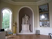 The temple's interior was furnished as a shrine to Shakespeare. It was dominated by a statue of the playwright commissioned by Garrick from the French Huguenot sculptor Louis-François Roubiliac at a cost of 300 guineas (£315, equivalent to approximately £32,000 now). Roubiliac chose to model the statue on the Chandos portrait of Shakespeare while Garrick himself is said to have posed for the sculpture.[4] Its appearance is rather more reminiscent of Garrick than Shakespeare; it is said that the actor struck a pose and exclaimed, "Lo, the Bard of Avon!" to illustrate how he wanted Shakespeare to be portrayed.[6] The statue's head was not to Garrick's satisfaction, and Roubiliac had to replace it with another, carved from a different type of marble. During Garrick's lifetime the statue was displayed in the temple. On his death it was willed to the British Museum, where it was on display in the King's Library until 1998, when it was moved to the British Library.[5] A copy of the statue, donated by the museum, is currently displayed in the temple.[8]