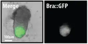 Brachyury (T/Bra), a gene which marks the primitive streak and the site of gastrulation, is up-regulated in the Gastruloids following a pulse of the Wnt/β-Catenin agonist CHIR99021[9] (Chi; other factors have also been tested[1]) and becomes regionalised to the elongating tip of the Gastruloid. From or near the region expressing T/Bra, cells expressing the mesodermal marker tbx6 are extruded from the similar to cells in the gastrulating embryo; it is for this reason that these structures are called Gastruloids.[1]