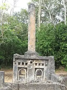 The pillar tombs at Gedi, which consist of masonry based structures topped with a pillar or column, are part of an architectural style of the medieval Swahili Coastal settlements.[4][19] A common feature on the pillar tombs at Gedi are decorative recessed panels.[7] Although there are four large pillar tombs at Gedi, the "dated tomb," located within the inner wall, stands out from the rest since it has Arabic inscription on it with the date A.H. 802 (A.D. 1399).[1]
