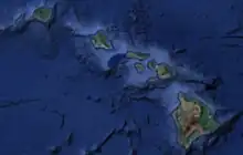 A satellite image of Hawaii, where volcanoes prevail on the Big Island; the islands have rugged coastlines, sandy beaches, and a tropical environment, though temperatures and humidity tend to be less extreme because of nearly constant trade winds from the east.
