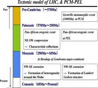 The Pan-African orogenic event is linked with NE-SW compression in Western and Eastern Gondwana. This compression could have possibly produced the strong seismic reflections which were detected in the Lützow-Holm Complex (LHC), as well as the neighboring Princess Elizabeth Land (PEL). After Gondwana broke up there seemed to be NW-SE extension which affected the graben structure found in the Prince Charles Mountains (PCM) and the diversity found around the Moho.[3][10]