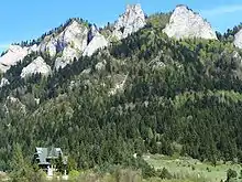 The Považie-Pieniny Belt has a complicated imbricated structure, represented especially by the Pieniny Klippen Belt.[6] It consists of Oravic, Gossau Group, and Magura units, as well as Inner-Carpathian units (e.g. Manín and Drietoma unit etc.). Placement of the Pieniny Klippen Belt into the Central Western Carpathians is ambiguous, because most authors consider Pieniny Klippen Belt as part of the Outer Carpathians.[3] The Považie-Pieniny Belt is divided into three zones: the Brezová, Peri-Klippen, and Klippen zones.