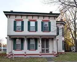 The George and Margaret Cooper House is a historic building located in Mount Pleasant, Iowa, United States. It is a fine example of the Italianate style, which was a popular style for residential architecture in Mount Pleasant from the 1850s to the mid-1880s[2] The two-story brick house features an asymmetrical plan, a low-pitched hip roof, wide bracketed eaves, and long, narrow windows. The full-width front porch has square paneled columns with foliate designs in the capitals and brackets. A single-story wing is attached to the rear of the house. A two-story, five sided wing was added to the west side of the house about ten years after the main part of the house was built. The house was built for George Cooper, a taylor, and it remained in his family until 1921. It was listed on the National Register of Historic Places in 1997.[1]