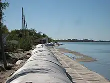 A geotextile tube is a large, tube-shaped bag made of porous, weather-resistant geotextile and filled with a sand slurry, to form an artificial coastal structure such as a breakwaters, dune or levee. Geotextile tubes are a component of the living shorelines approach to coastal management. They are aligned with the shoreline to weaken wave energy and protect against coastal erosion. The tubes facilitate oyster reef development and create areas to dispose of new dredge material.[1] Geotextile tubes are also installed for land reclamation and temporarily installed during the dewatering phase of a dredging operation.