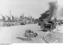 Hitler's pressing for a German invasion of Poland in 1939 placed tremendous strain on the German war machine, which had been gradually gearing up after the Treaty of Versailles restrictions for "total war" ("totaler Krieg") in 1942 or 1943.[110] The German navy was also critically short of maritime and military assets and did not achieve full mobilization until 1942.[111] While the Soviet alliance provided a huge military benefit to Germany, which thereafter had to station only four regular and nine territorial divisions on its eastern border,[112] even the quick Germany victory in Poland strained its 1939 military resources, leaving it with only six weeks of munitions supplies and no considerable manpower reserve.[113] In the face of a British blockade, the only remaining state capable of supplying Germany with the oil, rubber, manganese, grains, fats and platinum it needed was the Soviet Union.[110]