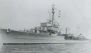 The ships carried eight above-water 53.3-centimetre (21 in) torpedo tubes in two power-operated mounts. Two reloads were provided for each mount. The standard torpedo for the Type 36B destroyers was the G7a torpedo.[14] It had a 300-kilogram (660 lb) warhead and three speed/range settings: 14,000 metres (15,000 yd) at 30 knots (56 km/h; 35 mph); 8,000 metres (8,700 yd) at 40 knots (74 km/h; 46 mph) and 6,000 metres (6,600 yd) at 44 knots (81 km/h; 51 mph).[15] They had four depth charge launchers and mine rails could be fitted on the rear deck that had a maximum capacity of 74–76 mines. 'GHG' (Gruppenhorchgerät) passive hydrophones were fitted to detect submarines and an S-Gerät sonar was also probably fitted. The ships were equipped with a FuMO 24/25 radar set above the bridge.[16]