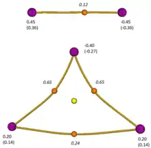 Molecular graphs of GeH and Ge2H in the lowest lying electronic state. Bond critical points shownin orange with corresponding ellipticity values, ring critical points shown in yellow, and attractors shown in purple with atoms-in-molecules charges plus natural bond order charges shown in parentheses.[6]
