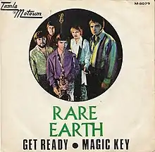 The rock band Rare Earth regularly played "Get Ready" in concert, where it was a popular staple of their live performances, and recorded a version for their 1968 Verve release, Dreams/Answers.[5] After signing with Motown, executive Barney Ales asked the band to re-record the song for their first release on Motown's then-unnamed rock subsidiary, due to the audience response to the band's cover.[5] After recording a version which was scrapped, the band themselves set up their own recording equipment and recorded a 21-minute version, which later had audience applause dubbed in.[5] The new recording of "Get Ready" was edited down to 2:46 for a single, which was given a Tamla Motown release in the UK, the only release by the band to appear on Motown itself, and unlike the Temptations' version, Rare Earth's recording was a success on the pop chart.[5] The single peaked at #4 on the Billboard Hot 100 chart in 1970.[6] The Rare Earth version of the song also peaked at number twenty on the R&B chart.[7]