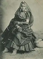 Luanchari (Hindi: लुआंचणी) is a full-dress garment. The luanchari is made up of two parts. The upper part is called choli, and is made of the same fabric as of the lehanga, but it is not uncommon to find the two pieces of the garment in different colours. The choli is stitched to the lehanga, to make a one-piece luanchari. This is commonly worn by the women in Pahari miniatures, and is quite similar to lehanga.[16] It may take over 21 yards of cloth to make a complete luanchari.[17] It is a traditional garment worn by Gaddis of Himachal Pradesh.[16]