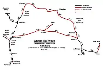 - ↑ "Rusty Rails: The story of Ghana's lost glory and government's new worry". MyJoyOnline.com. 2019-10-29. Retrieved 2020-05-30.