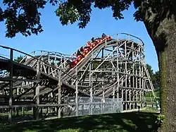Ghoster Coaster opened, along with the entire park, on May 23, 1981, as one of the five original roller coasters to open with the park. The other four were Dragon Fyre, Thunder Run, the Wilde Beast, and the Mighty Canadian Minebuster. All three wooden coasters were designed by Curtis D. Summers and built in-house by the Taft Broadcasting Company.[2] Some sources claim Philadelphia Toboggan Company (PTC) built these coasters, but PTC stopped building coasters in 1979.[3]