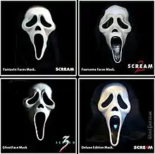 The 1991–92 "Fantastic Faces" edition of the mask used in Scream is made of thin, white rubber with blackened eyes, nose, and mouth. Despite being fictionally a character in the movie cast, in the first, second, and fourth films, the costume was most often worn by stunt performer Dane Farwell, who gave the character specific characteristics such as cleaning the knife after killing, also giving the stature and a unique movement to the character.[22] In the first film, Craven wore the costume during the opening murder scene, where the character is struck by a phone, and by Ulrich only once during a finale scene, where the character prepares to murder Randy.[22] Despite Stu wearing the costume in the film, actor Lillard never actually wore the outfit.[22] Scream 2 features a slightly redesigned version of the mask from the "Fearsome Faces" line, possessing slightly-altered eyes and an indented chin.[27] Following Scream 2, the Ghostface mask became part of the "Ghostface" line of masks featuring several variations of the design including glow-in-the-dark models.[27] The plain, white version of the Ghostface line mask is used in Scream 3 by Bridger.[27] Another edition of the mask was developed for use by Ghostface in Scream 4, dubbed "The Deluxe Edition Mask"; again, similar to the original Ghostface design, but constructed of thicker rubber with a pearlescent finish.[27]