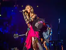 "Ghosttown" had been initially absent from the 2015–2016 Rebel Heart Tour. However, on the September 19, 2015, stop at Brooklyn's Barclays Center, Madonna announced that she would perform the song but it was unrehearsed. "That is the truth. So, if I make mistakes, will you forgive me?", she added and sang an acoustic version. According to Robbie Daw from Idolator the performance received positive response from the audience.[108] Slant Magazine's Sal Cinquemani described it as a "stirring, if pitchy, rendition of [the] shoulda-been-a-sleeper-hit... which brought seemingly genuine tears to [Madonna's] eyes, a development that seemed to surprise even her".[109] On July 27, 2017, Madonna performed "Ghosttown" at Leonardo DiCaprio's annual fundraising gala in Saint-Tropez, France.[110]