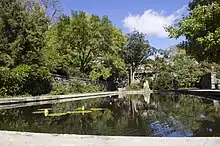 The gardens are built in a series of terraces descending down the slope from the outcrop on which the house stands. From top to bottom, there is a drop of about 30 feet (9.1 m).[6] A curving staircase made from marble links the house to the bottom of the terraces, descending through the Flagstone, Evergreen and Pool terraces to the Flower Garden at the bottom.[4] The latter is planted along the lines of a color wheel in a style closely resembling that of Gertrude Jekyll. From the Flower Garden, a 200 feet (61 m) long avenue of Bald Cypresses (planted between 1921 and 1925) leads to a large fountain and a teahouse that the Sharps used for lunches and to entertain guests.[6]