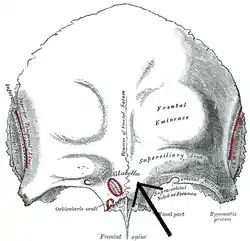 ![]() Frontal bone, outer surface, (glabella visible near bottom of bone) | |